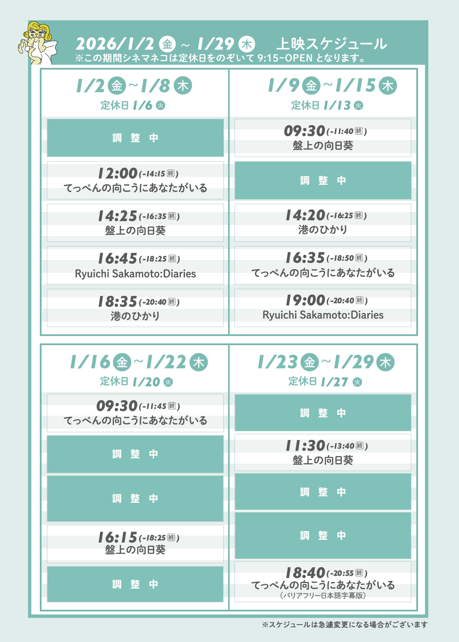 - 1/2 – 1/29:1月上映スケジュールのご案内