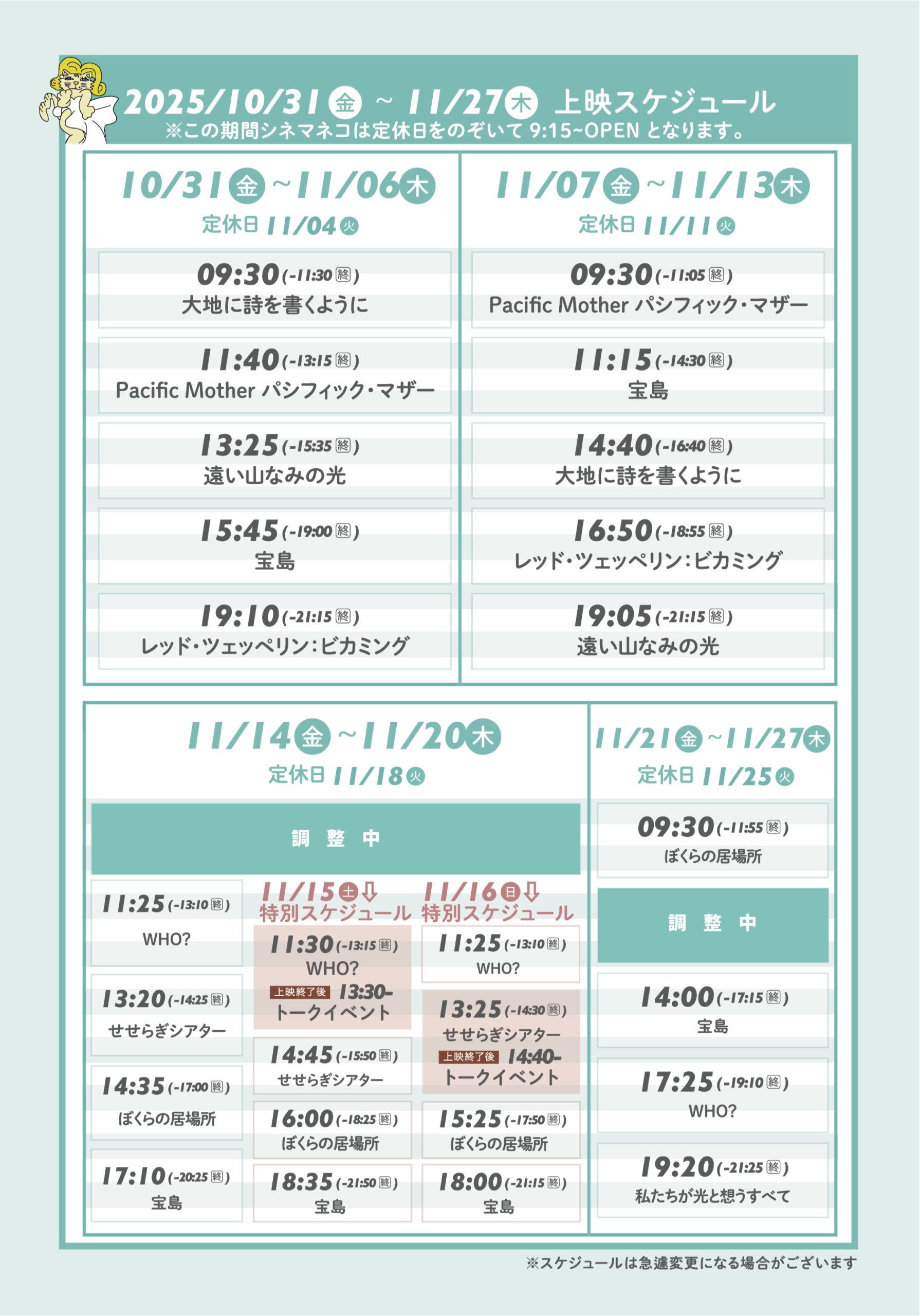- 10/31 – 11/27:11月上映スケジュールのご案内